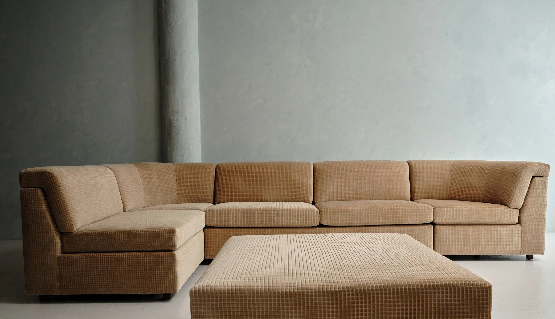 Verdant Arc Sofa A sculptural, low-profile sofa that pairs a moss-toned base with graphic cushions, balancing grounded warmth and refined modern form.